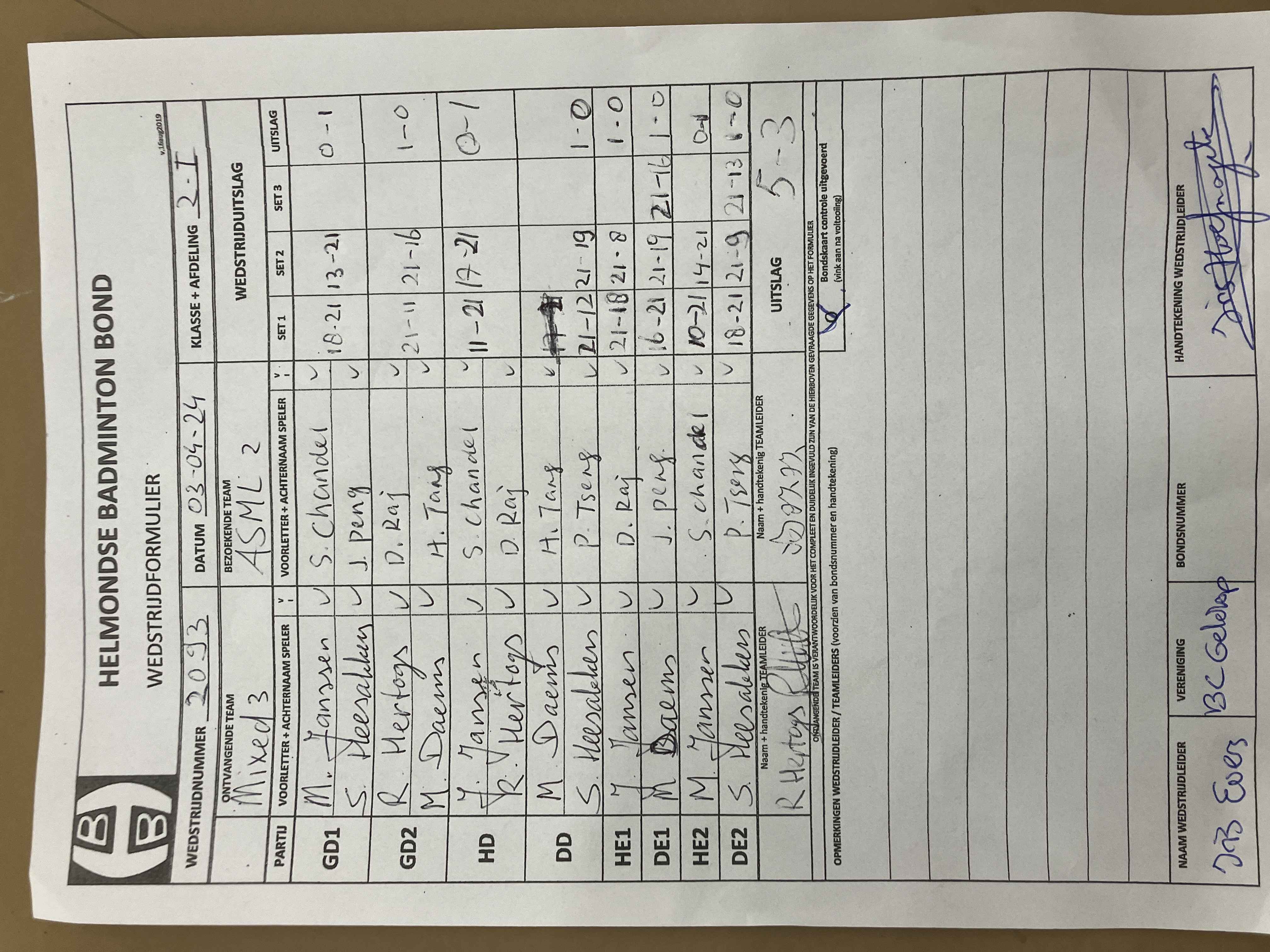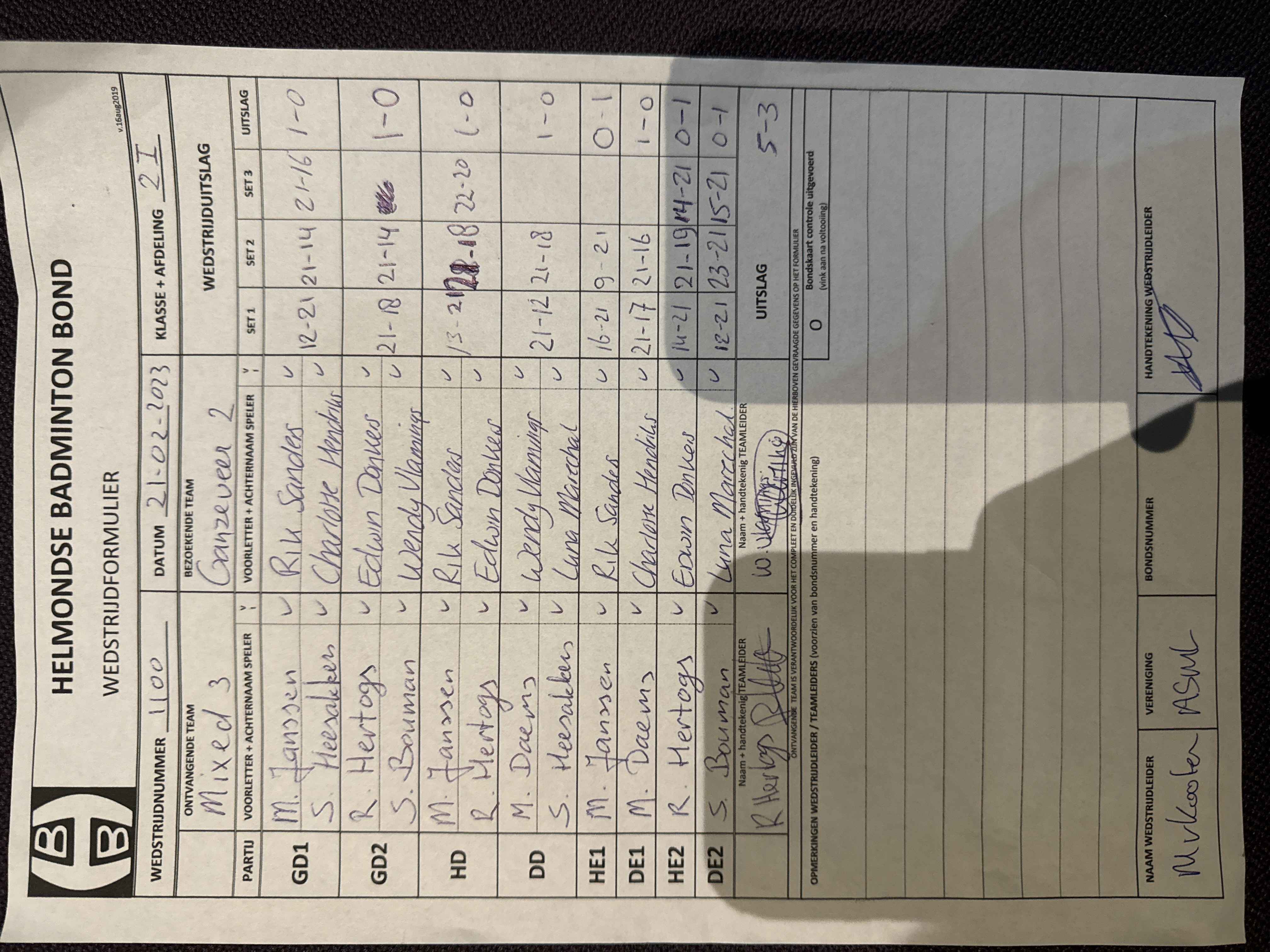 | 1100 | wo. 21-02-2024 | Mixed 3 | - | Ganzeveer 2 | 2 | 5 - 3 | |||