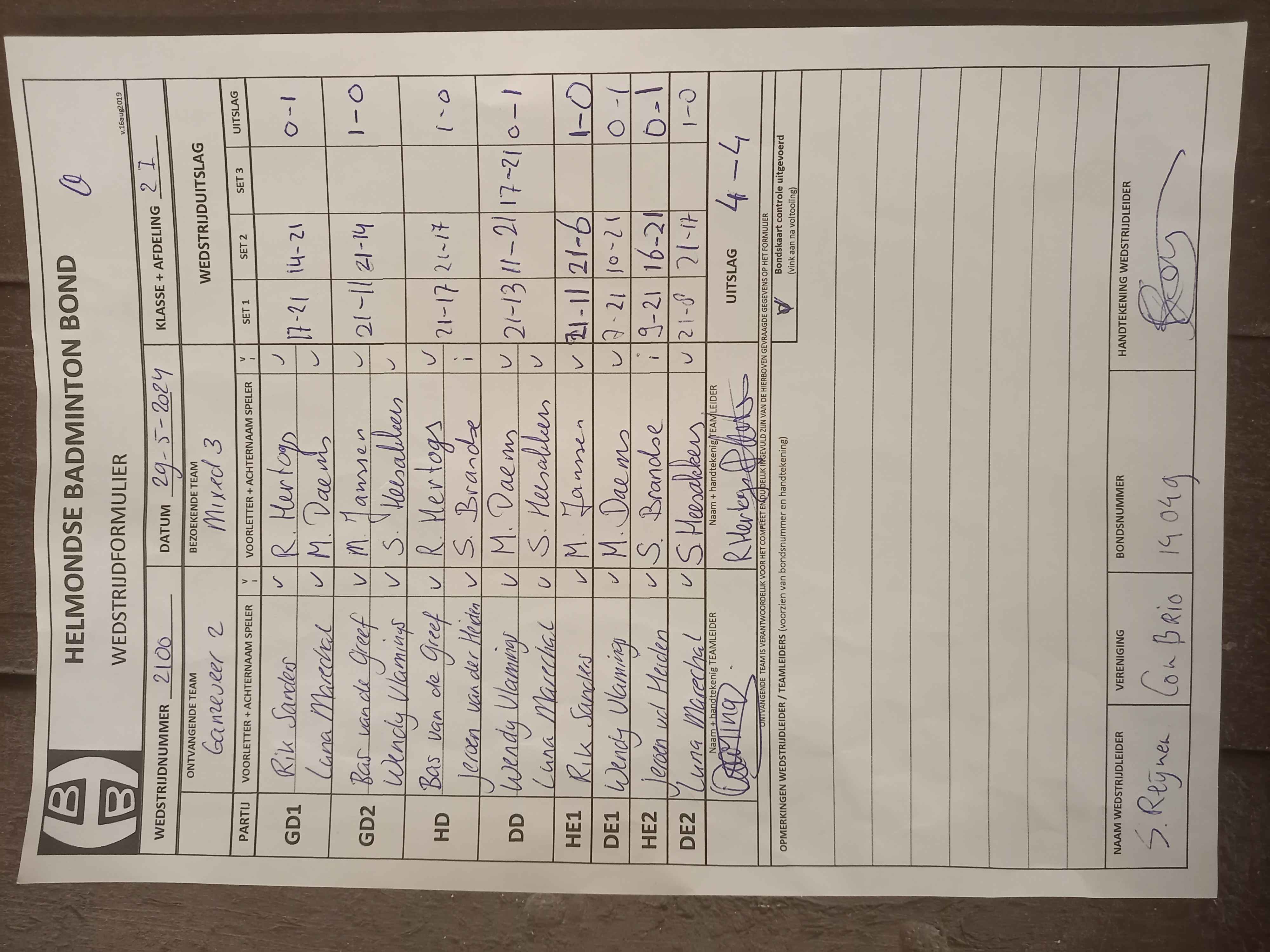 | 2100 | wo. 29-05-2024 | Ganzeveer 2 | - | Mixed 3 | 5 | 4 - 4 |