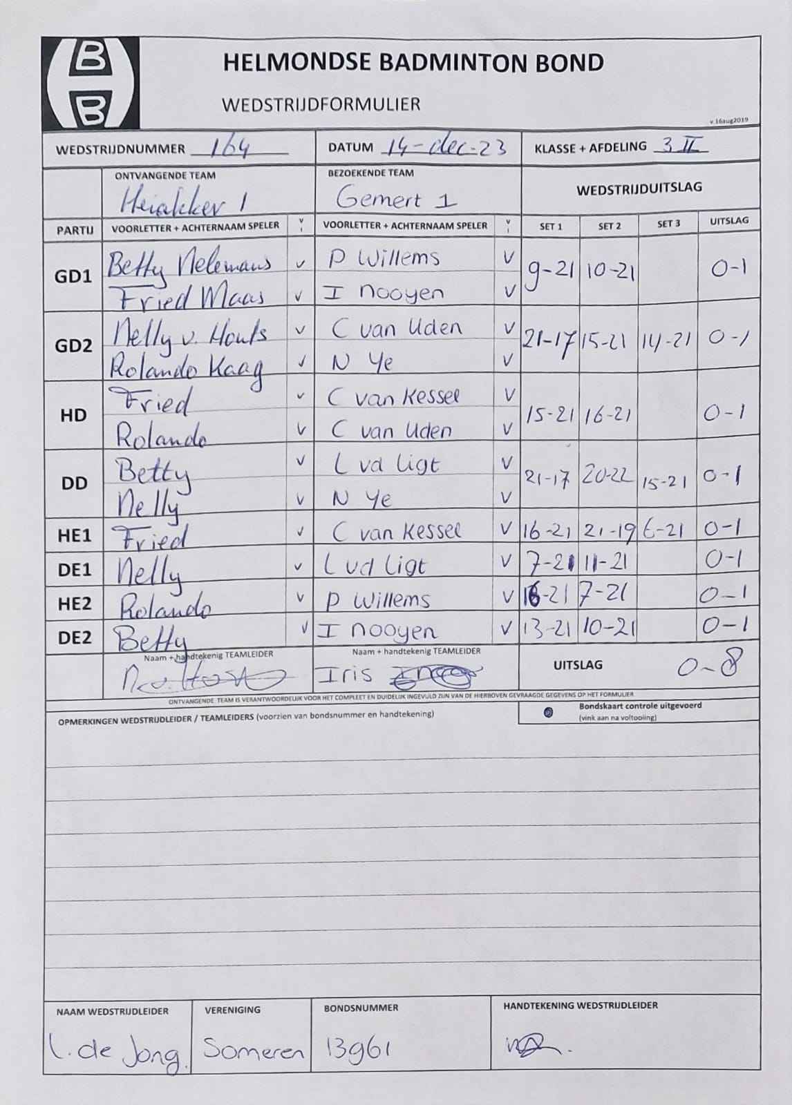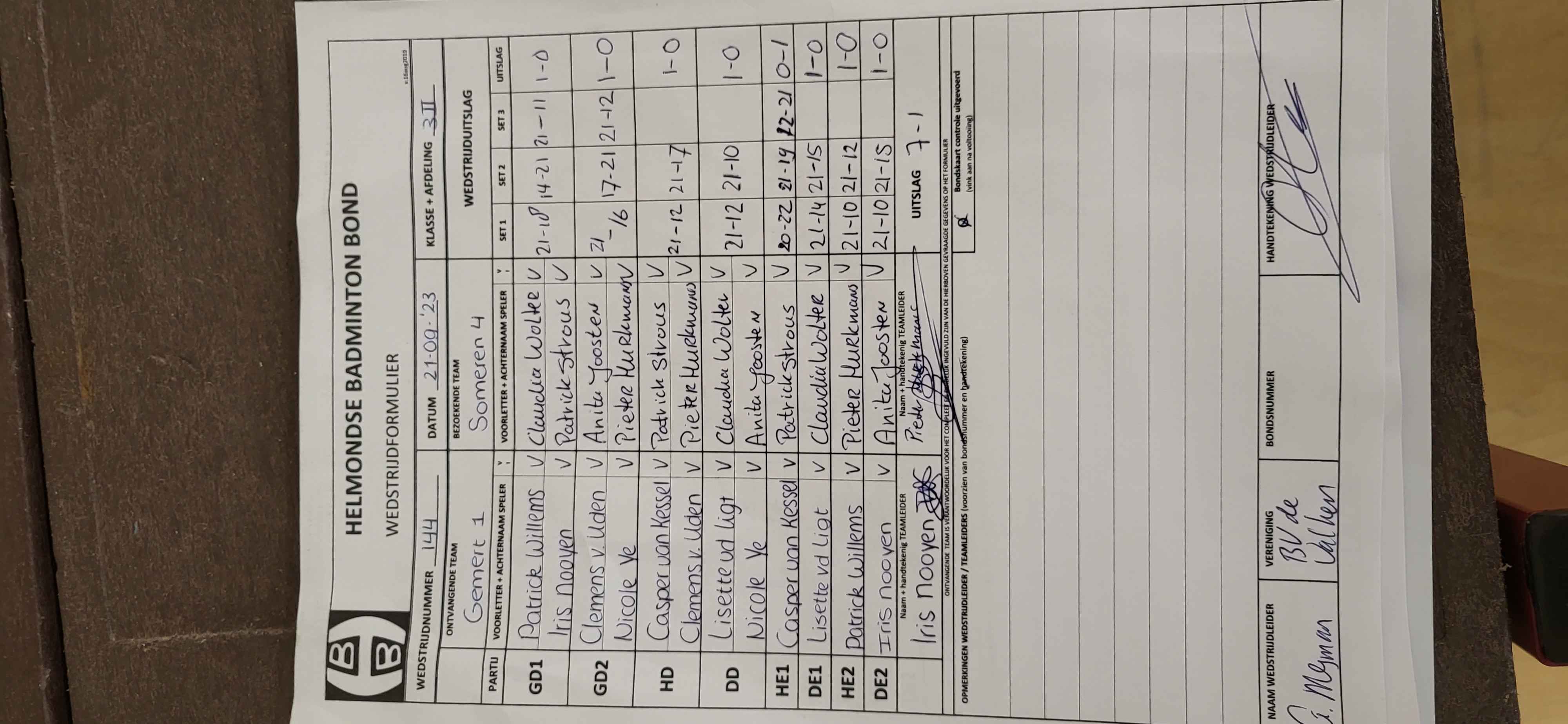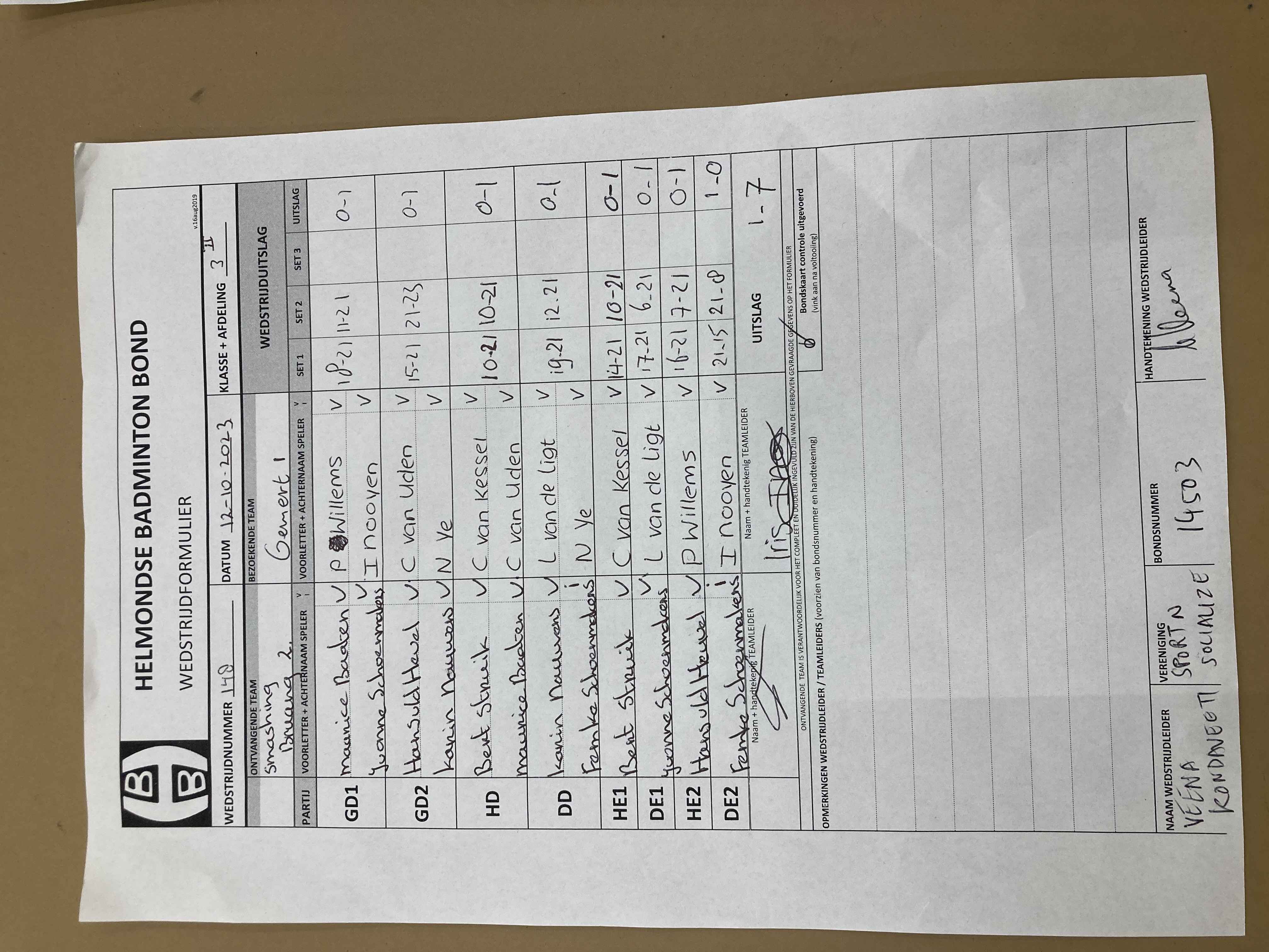 | 148 | do. 12-10-2023 | Smashing Bruang 2 | - | Gemert 1 | 2 | 1 - 7 | |||