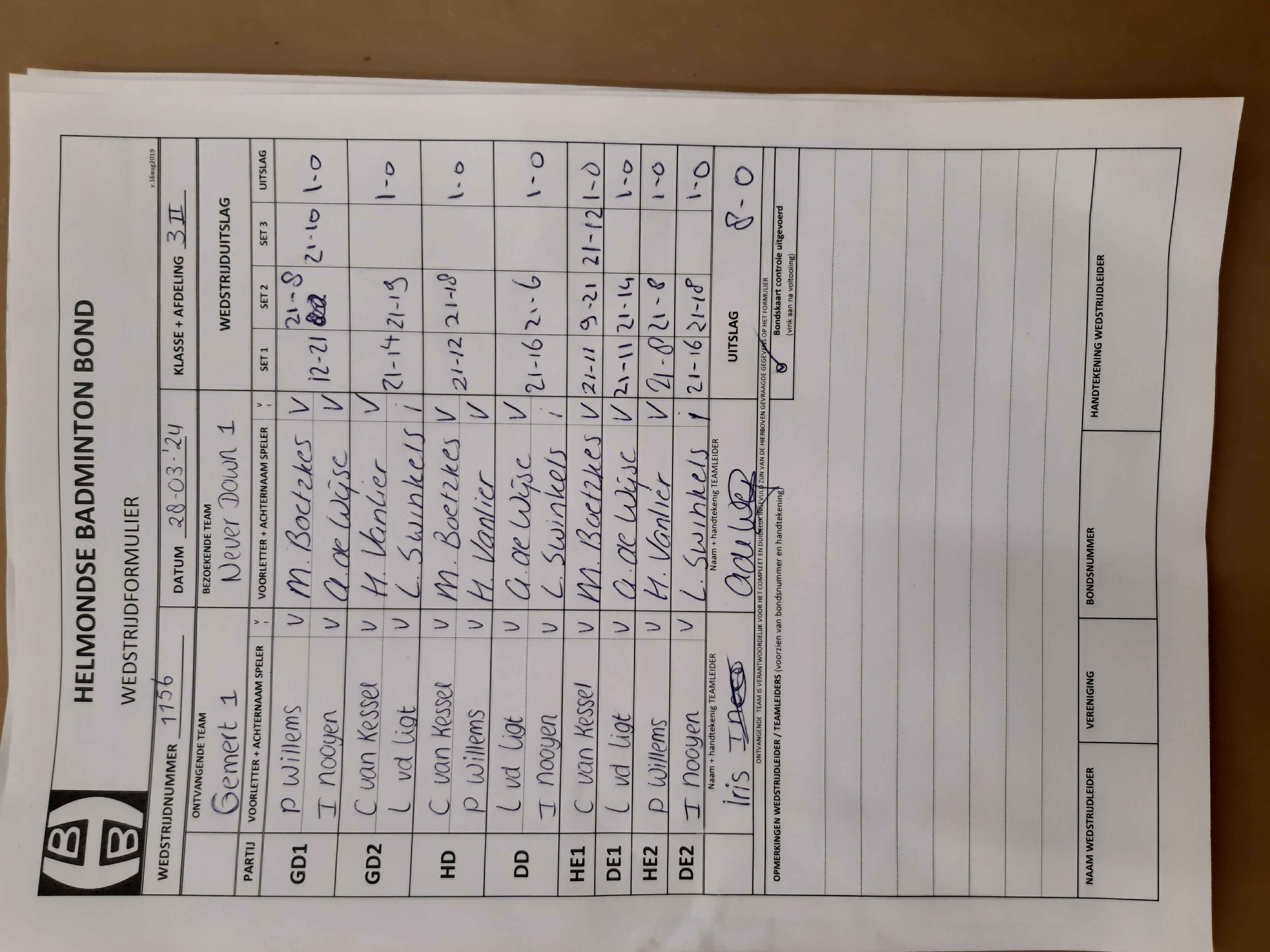 | 1156 | do. 28-03-2024 | Gemert 1 | - | Never Down 1 | 1 | 8 - 0 | |||