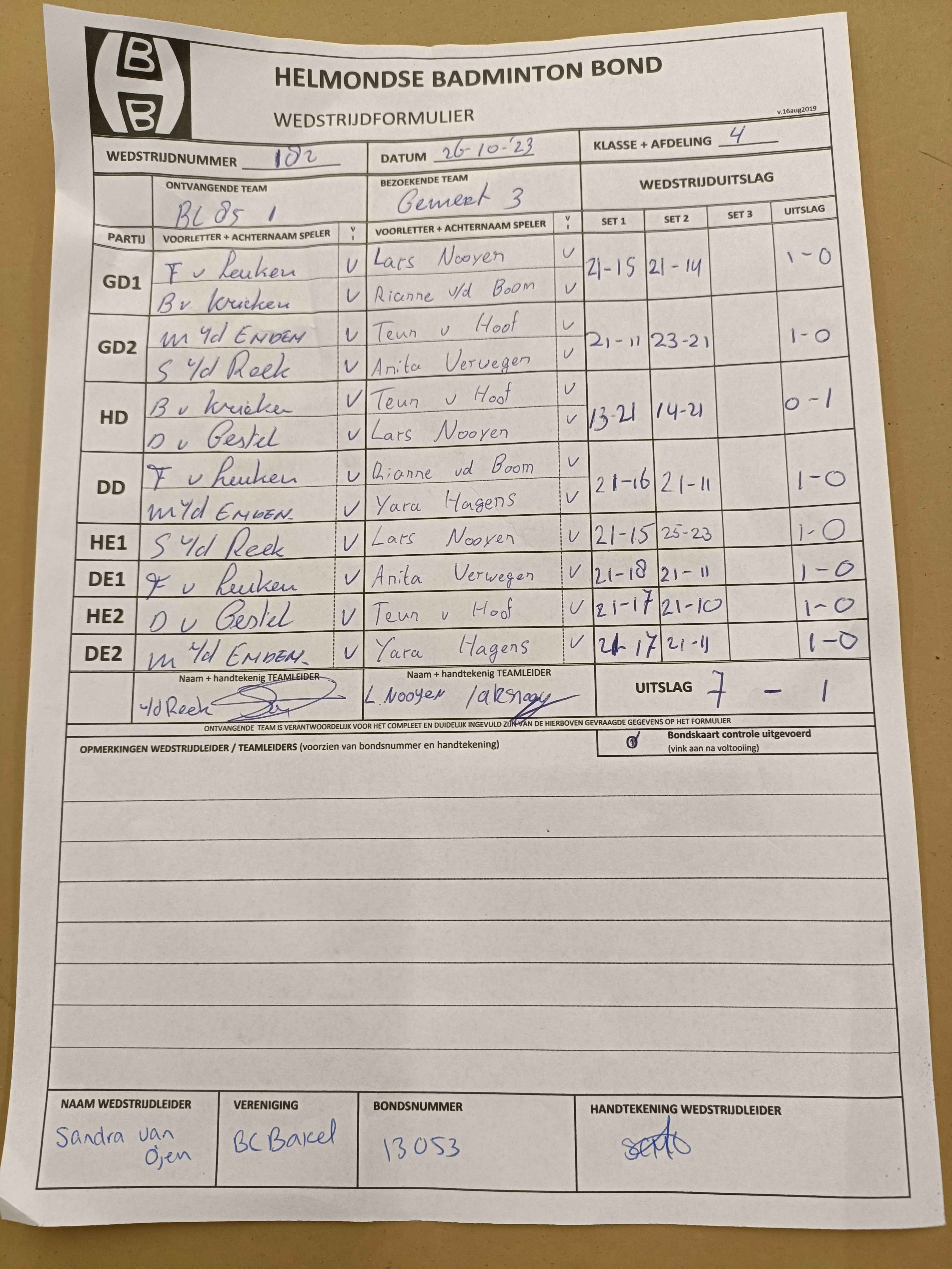 | 182 | do. 26-10-2023 | BC '85 1 | - | Gemert 3 | 13 | 7 - 1 | |||