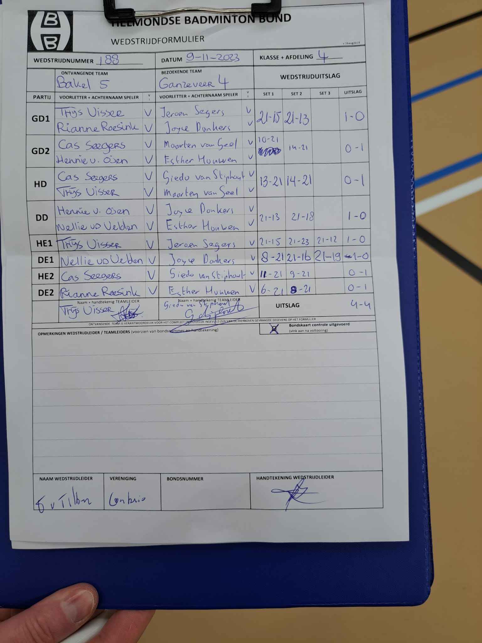 | 188 | do. 09-11-2023 | Bakel 5 | - | Ganzeveer 4 | 13 | 4 - 4 | |||
