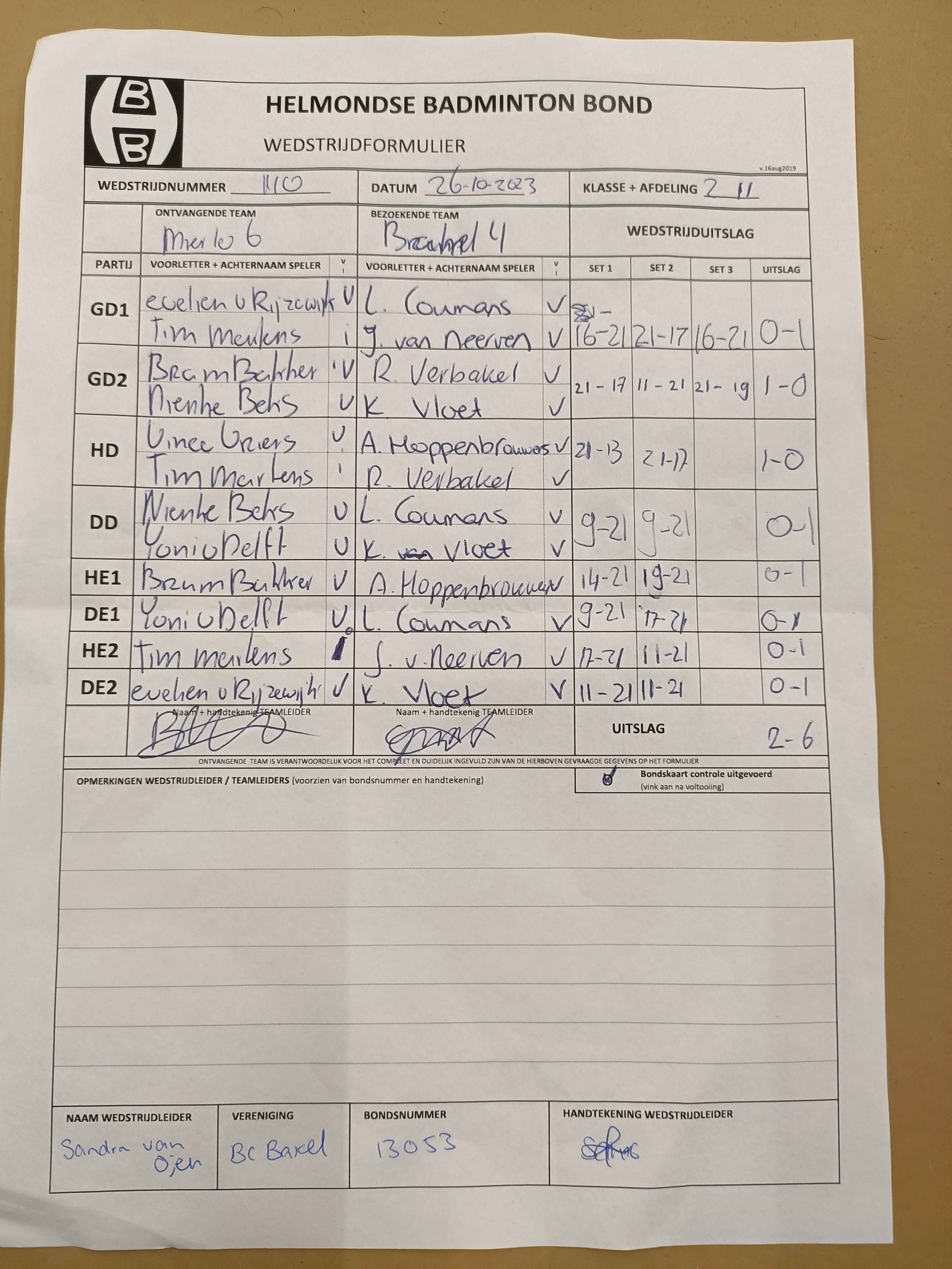 | 110 | do. 26-10-2023 | Mierlo 6 | - | Bakel 4 | 14 | 2 - 6 | |||