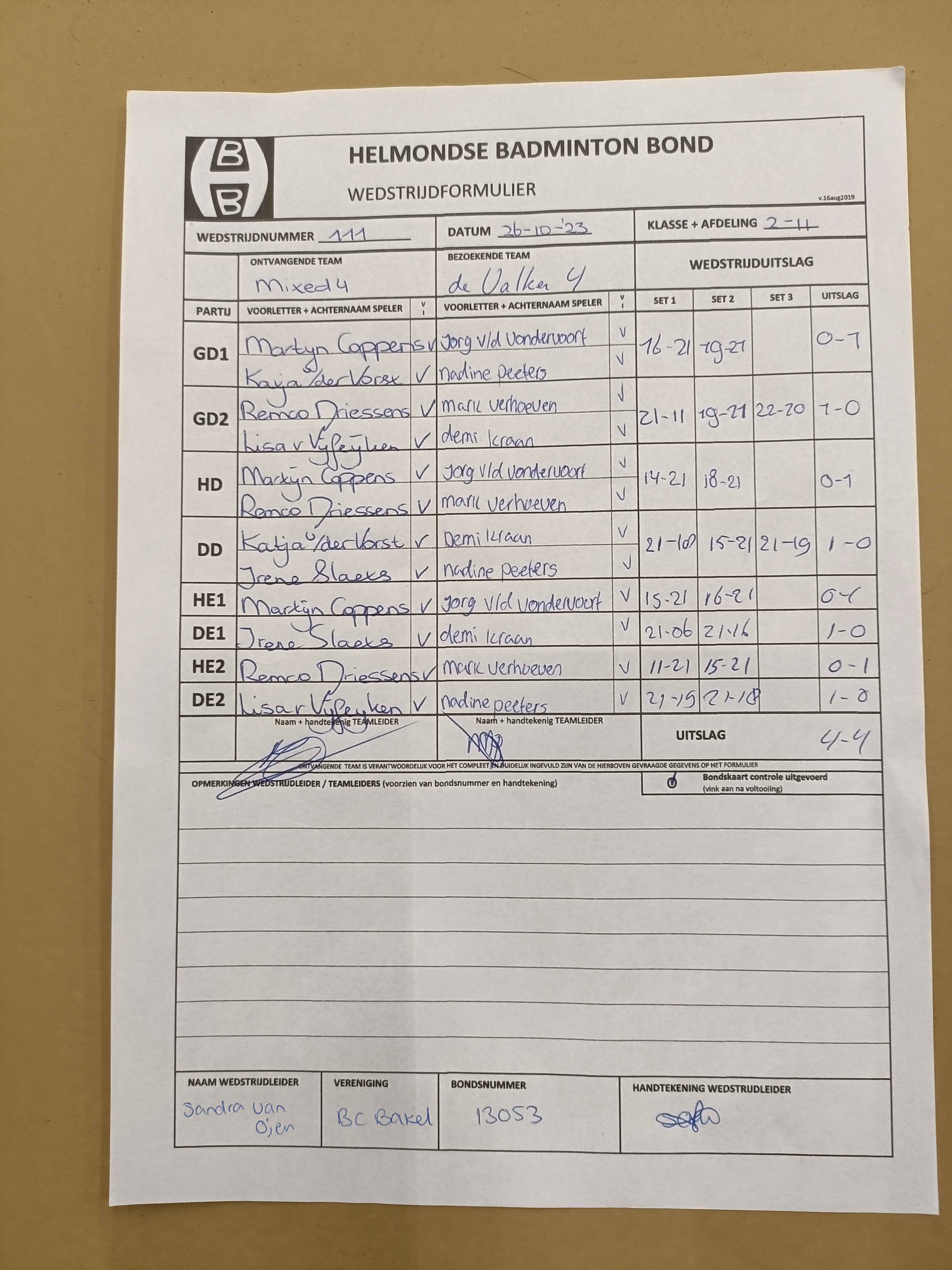 | 111 | do. 26-10-2023 | Mixed 4 | - | De Valken 4 | 15 | 4 - 4 | |||