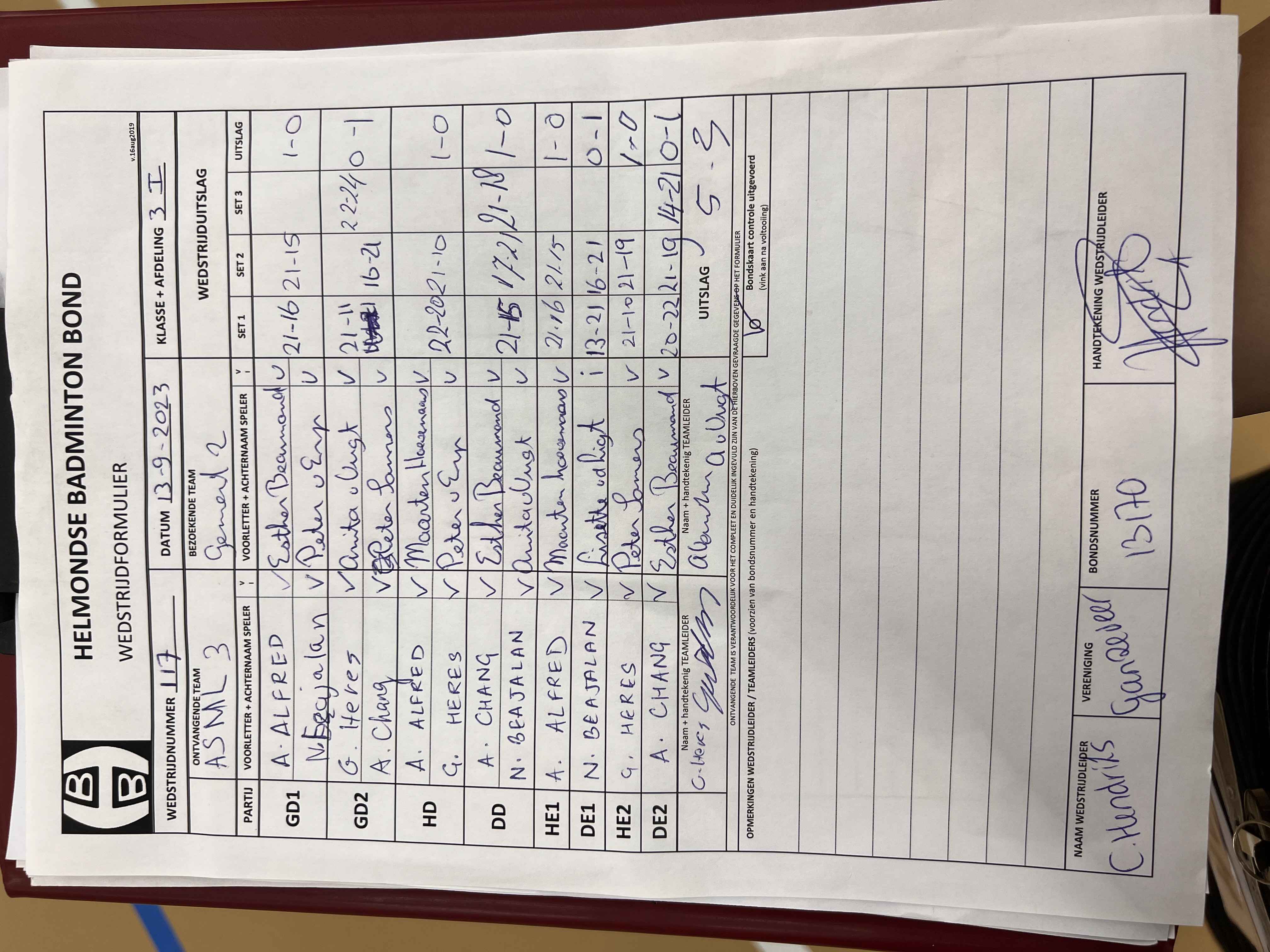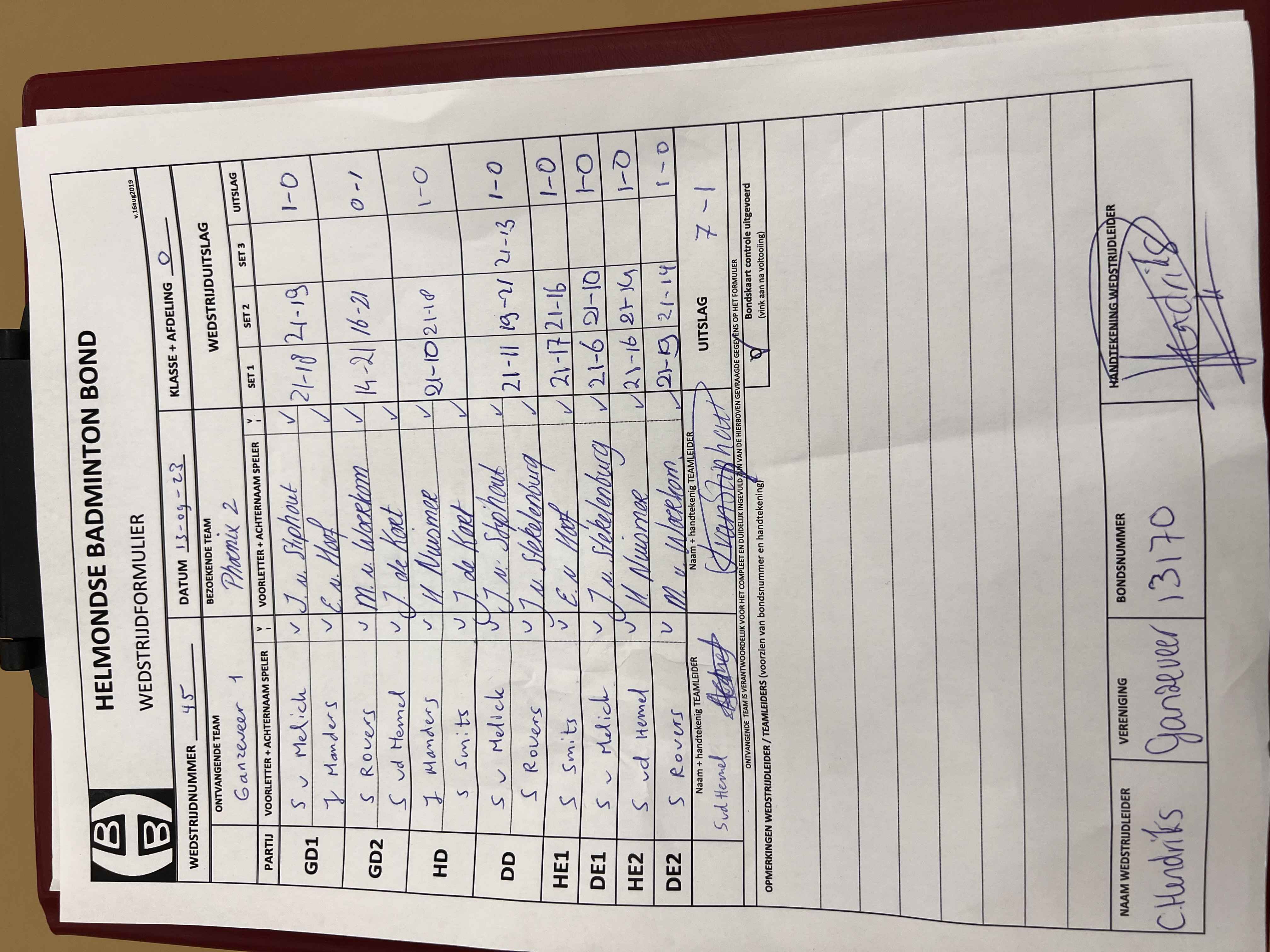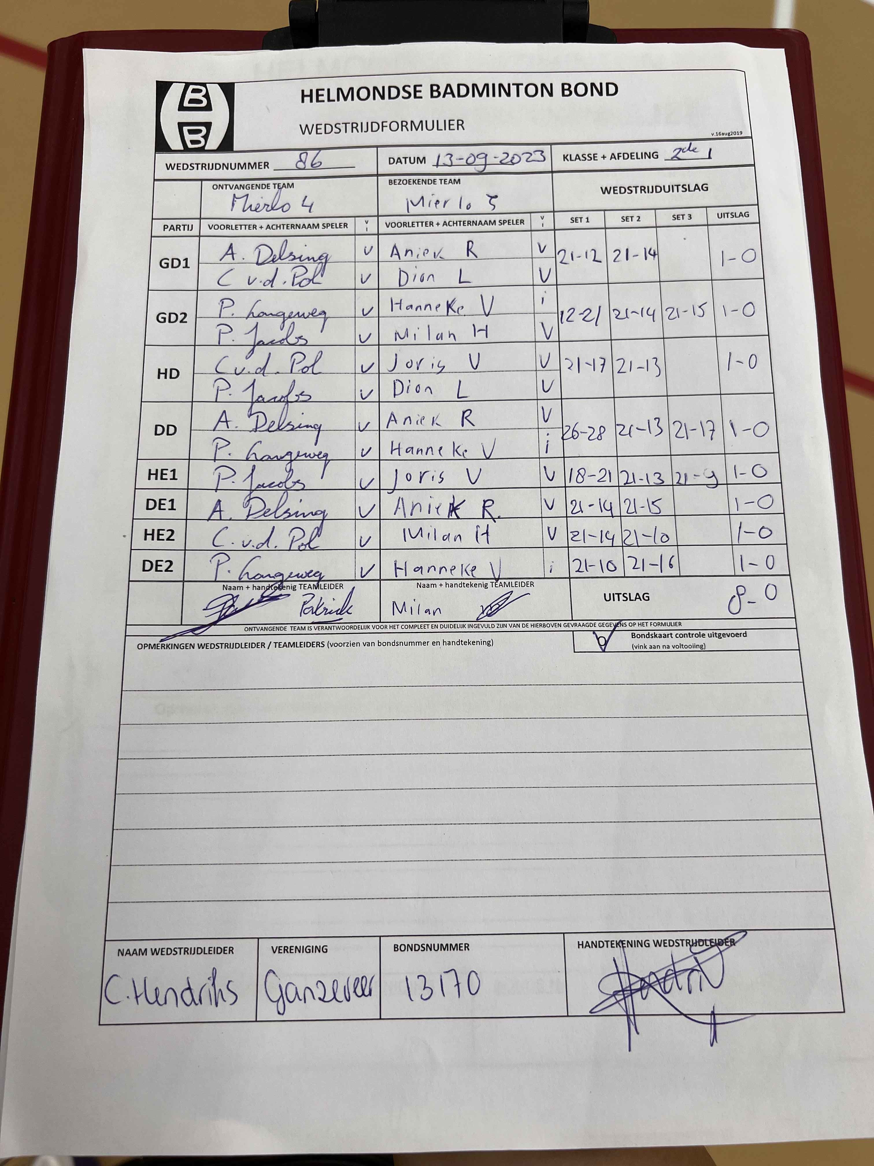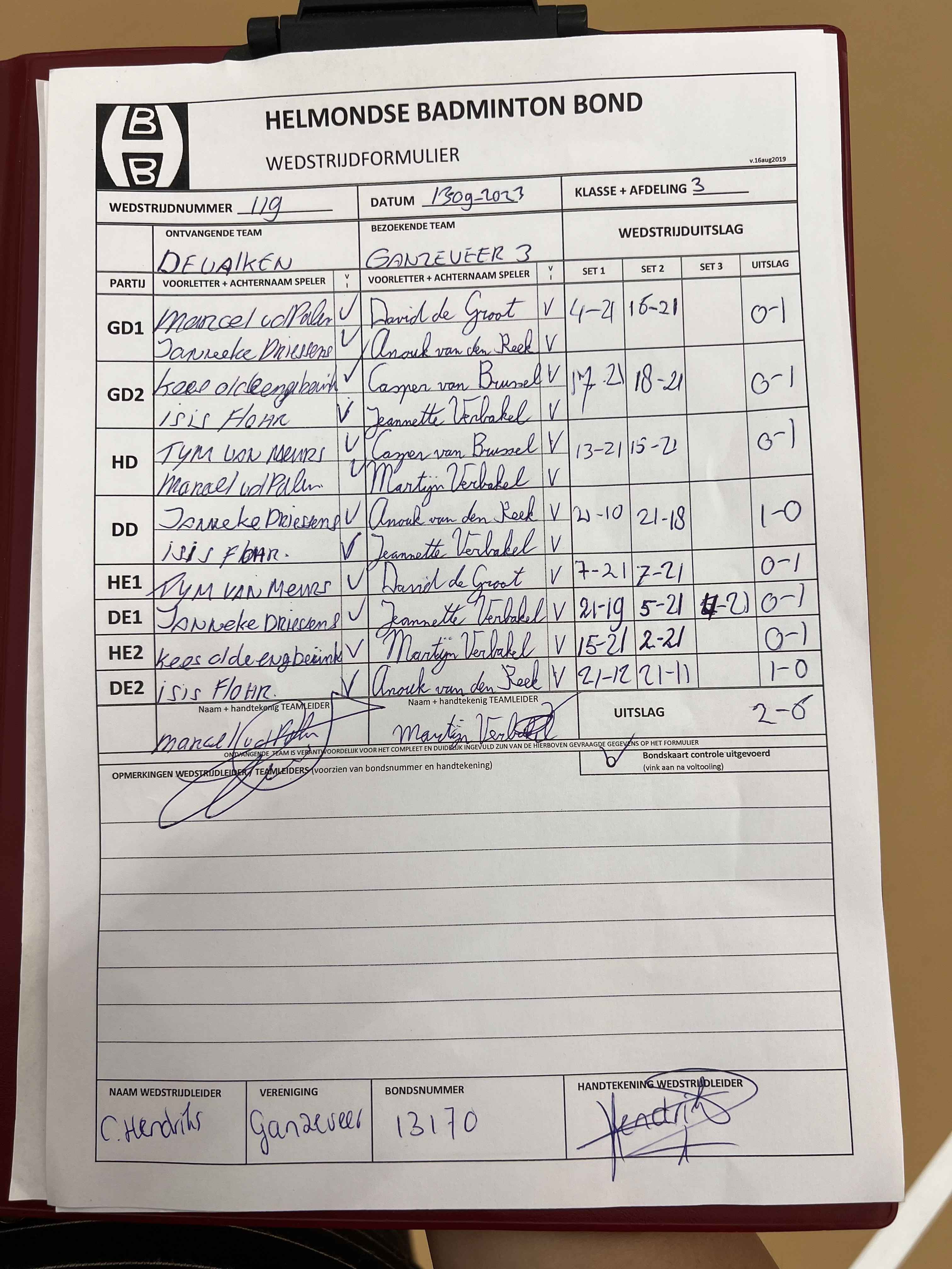 | Klasse | Nr | Thuis | - | Uit | Baan | |