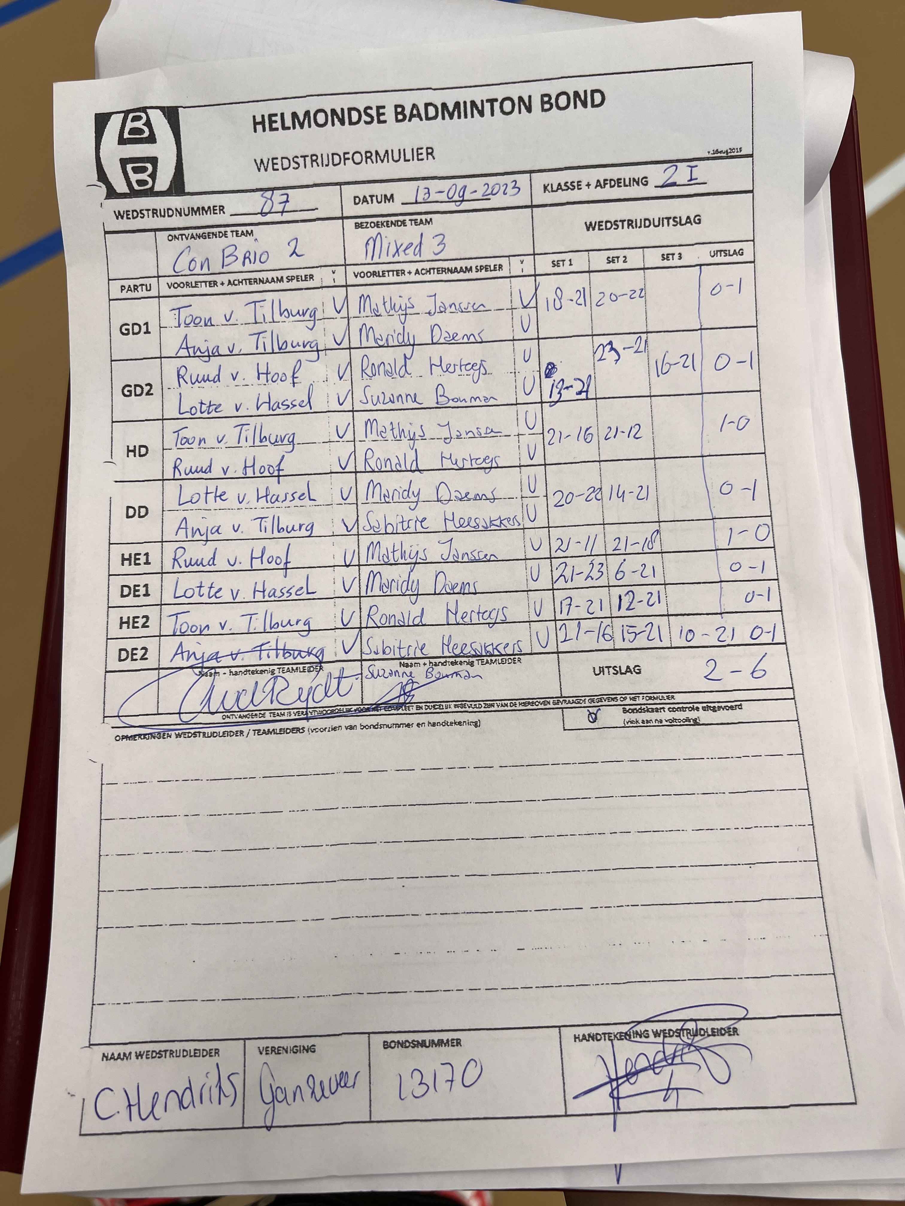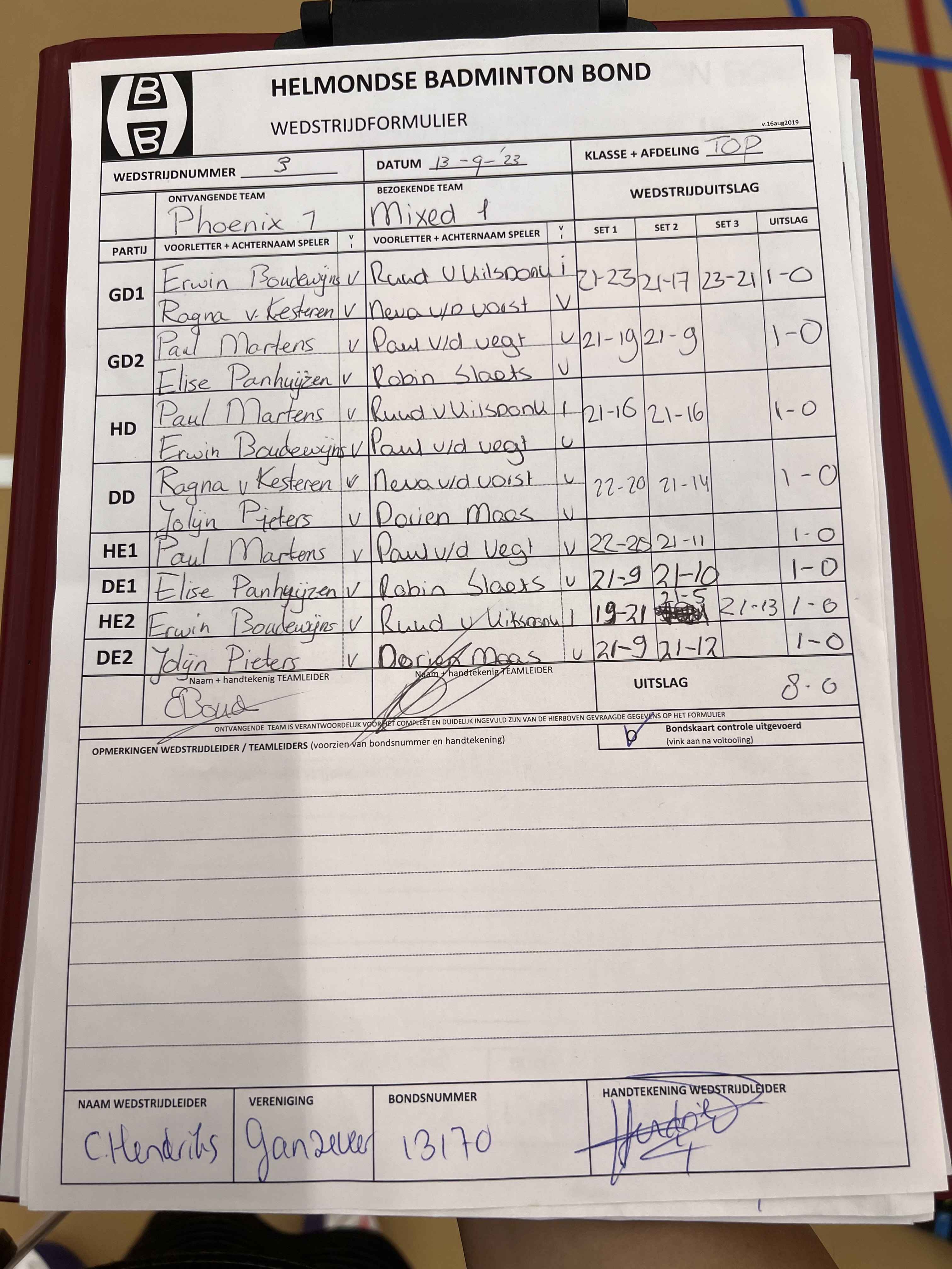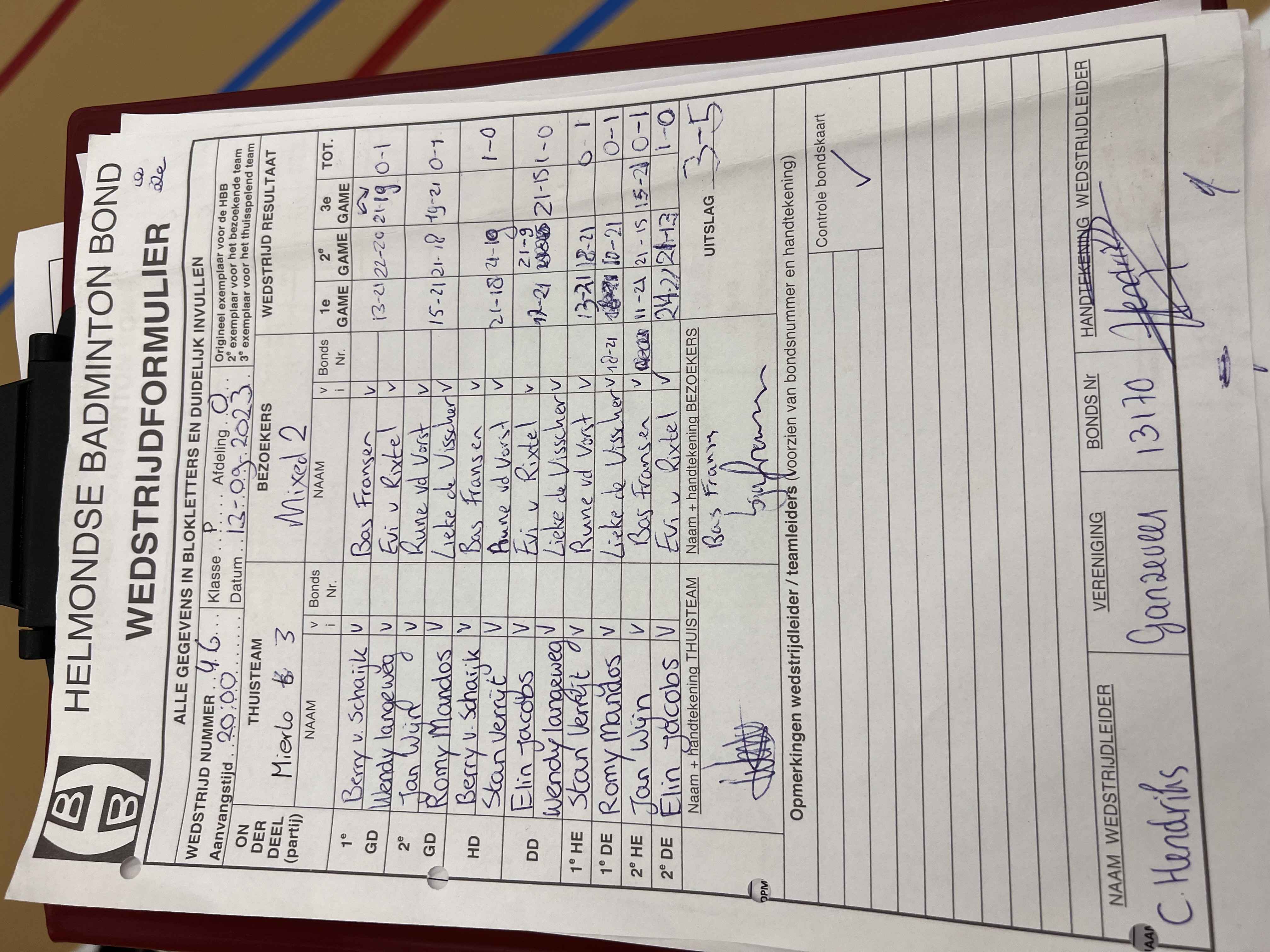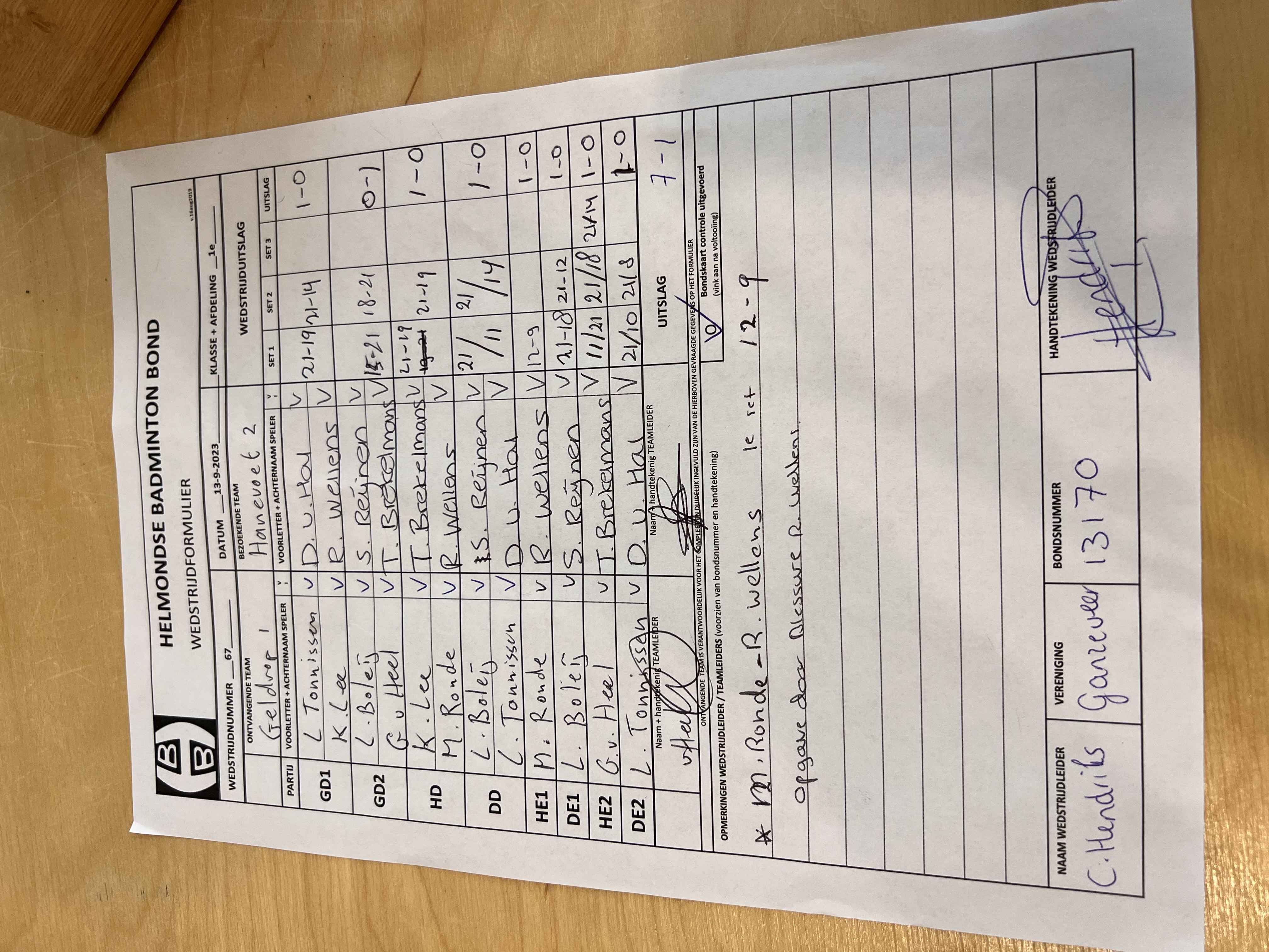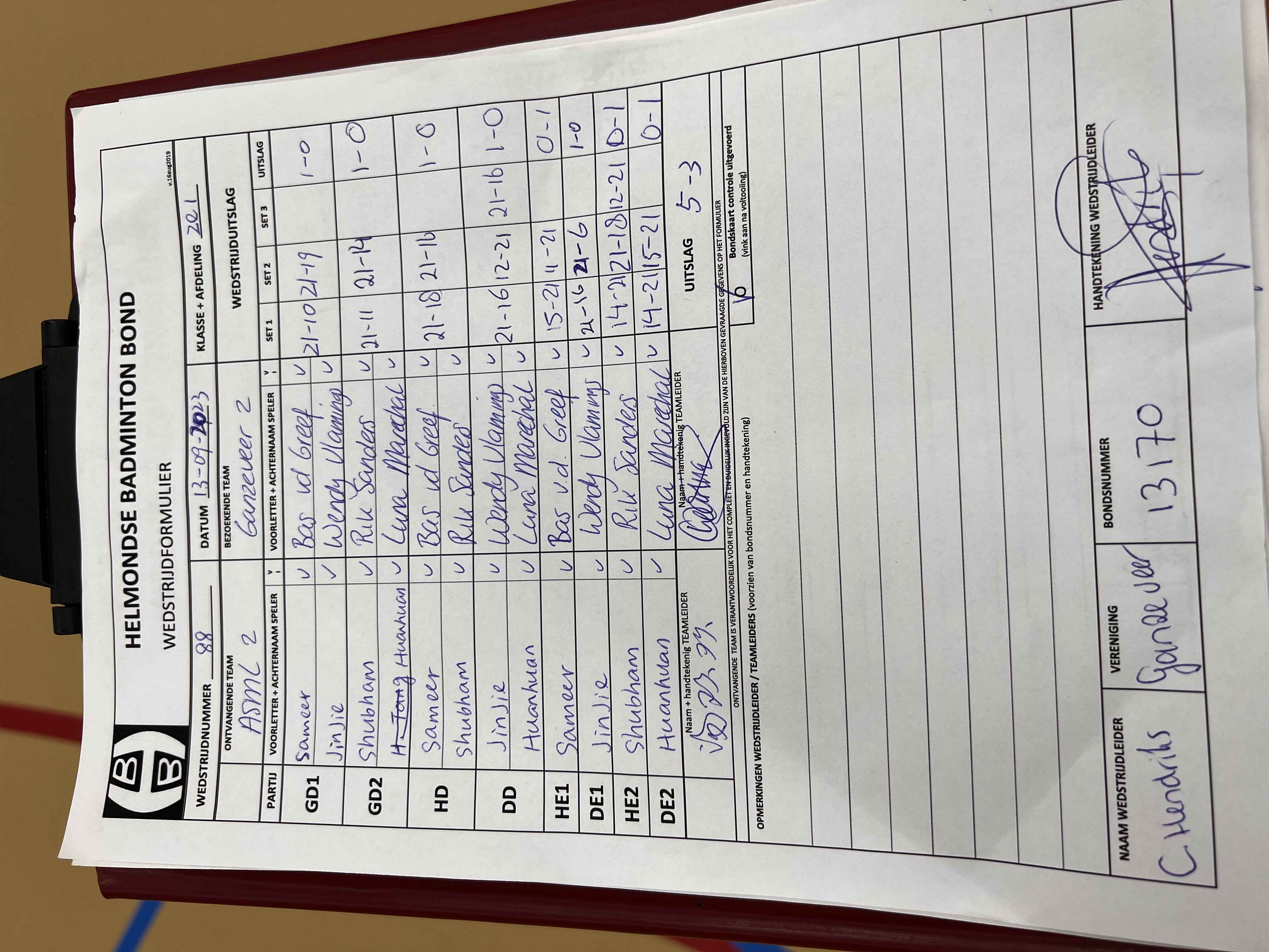 | Klasse | Nr | Thuis | - | Uit | Baan | |