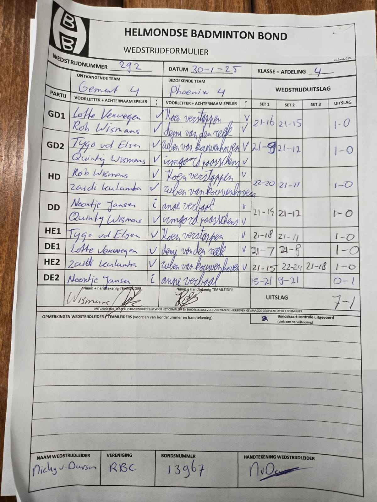 | 292 | do. 30-01-2025 | Gemert 4 | - | Phoenix 4 | 13 | 7 - 1 | |||