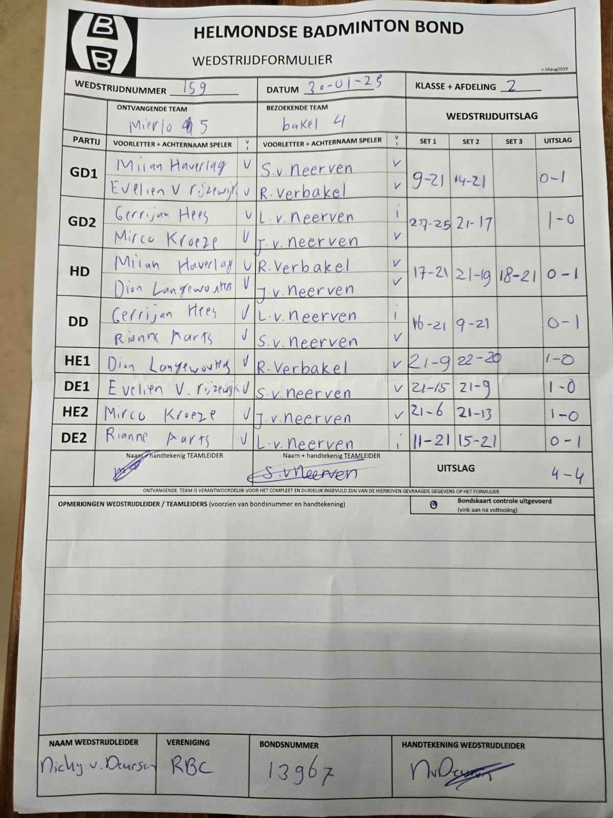 | 159 | do. 30-01-2025 | Mierlo 5 | - | Bakel 4 | 4 | 4 - 4 | |||