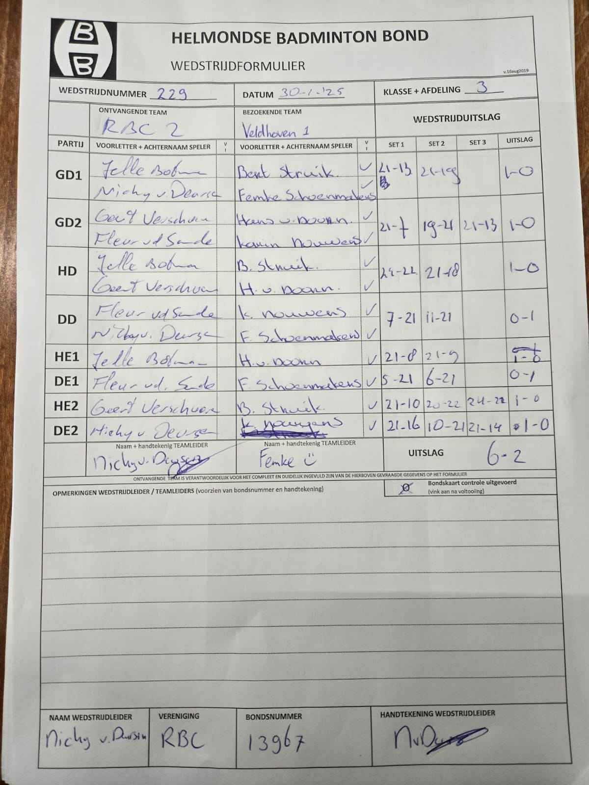 | 229 | do. 30-01-2025 | RBC 2 | - | Veldhoven 1 | 11 | 6 - 2 | |||