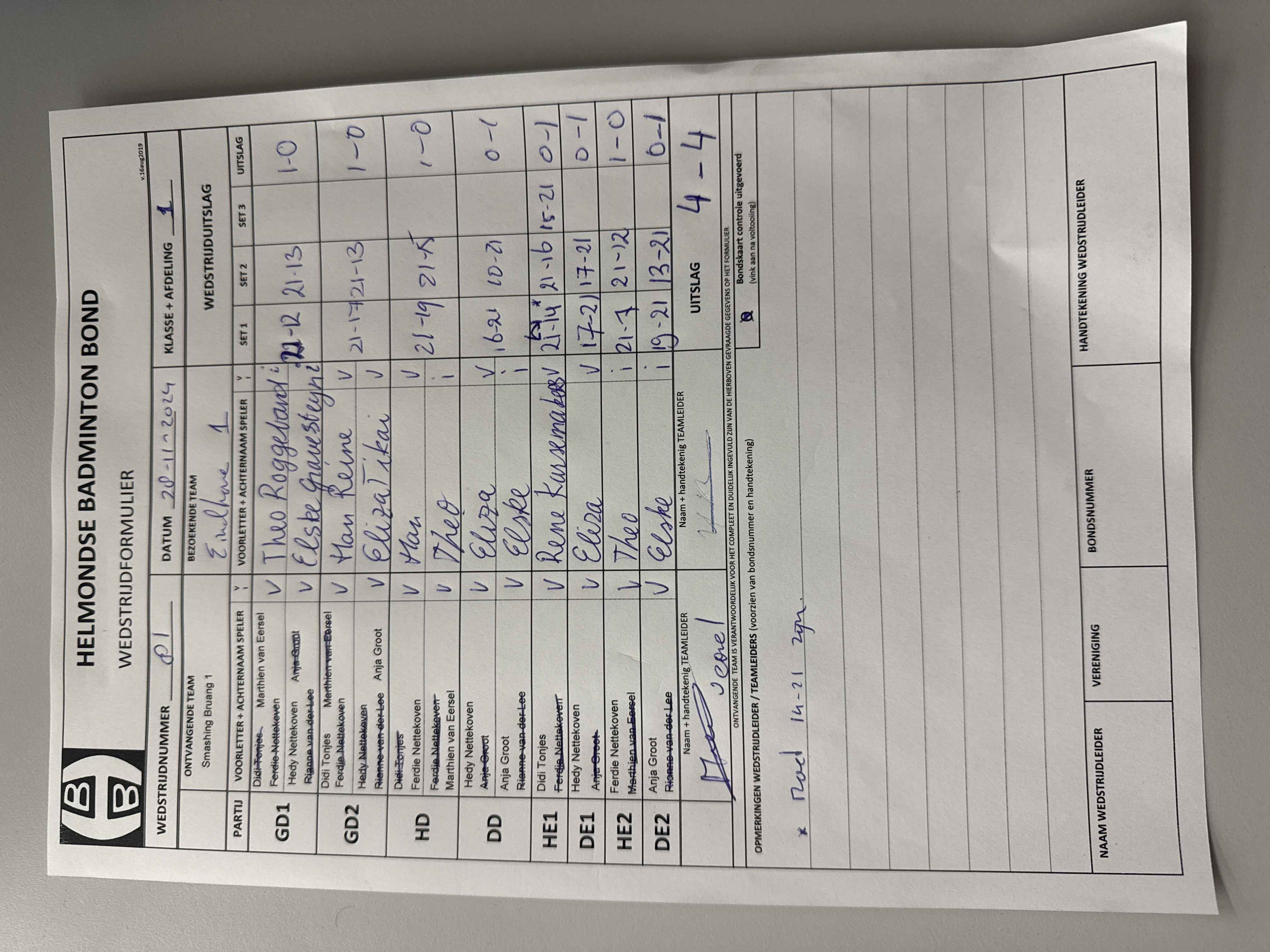 | 81 | do. 28-11-2024 | Smashing Bruang 1 | - | Eindhoven 1 | 2 | 4 - 4 | |||