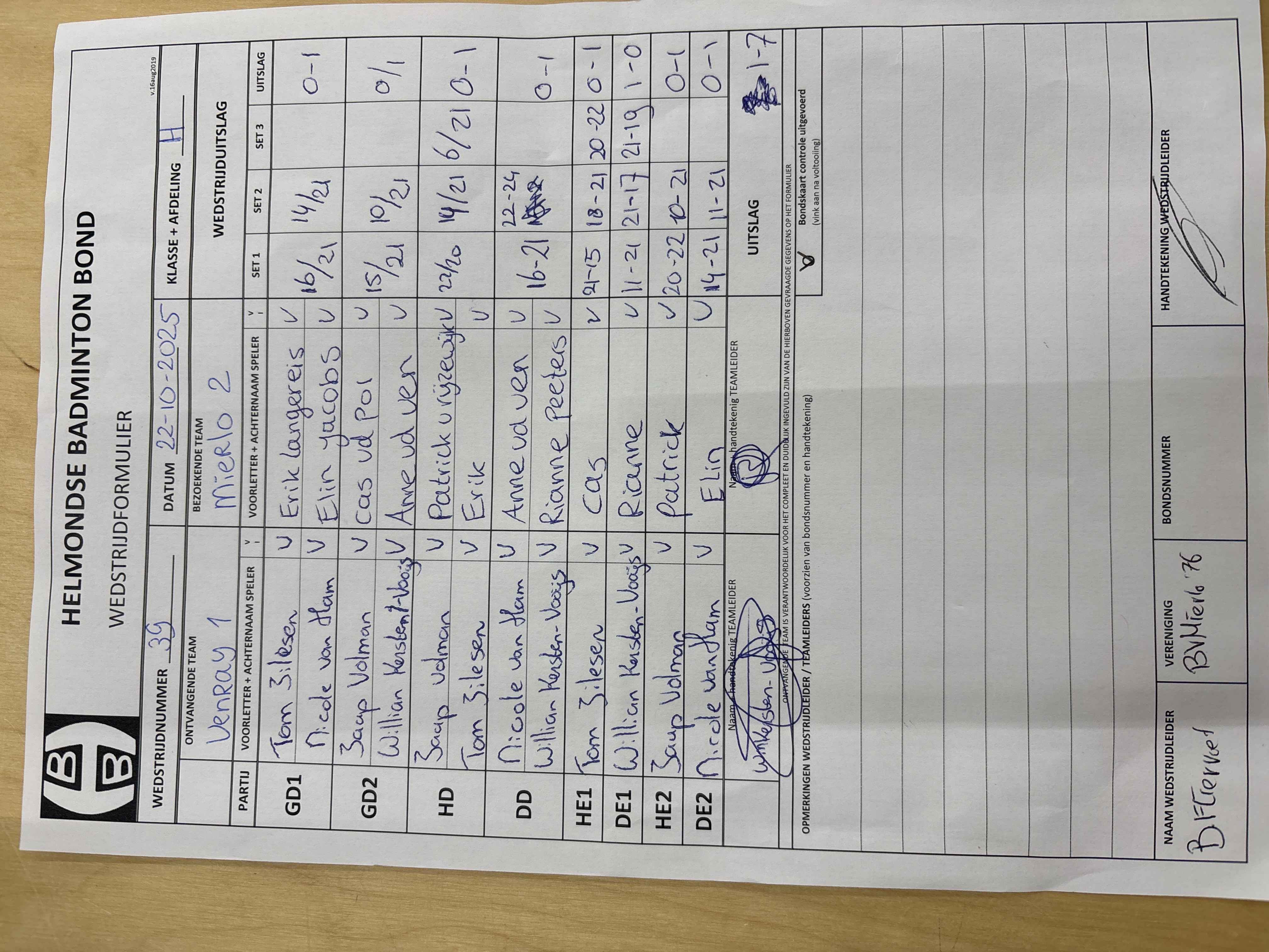 | 39 | wo. 22-10-2025 | Venray 1 | - | Mierlo 2 | 2 | 1 - 7 | |||